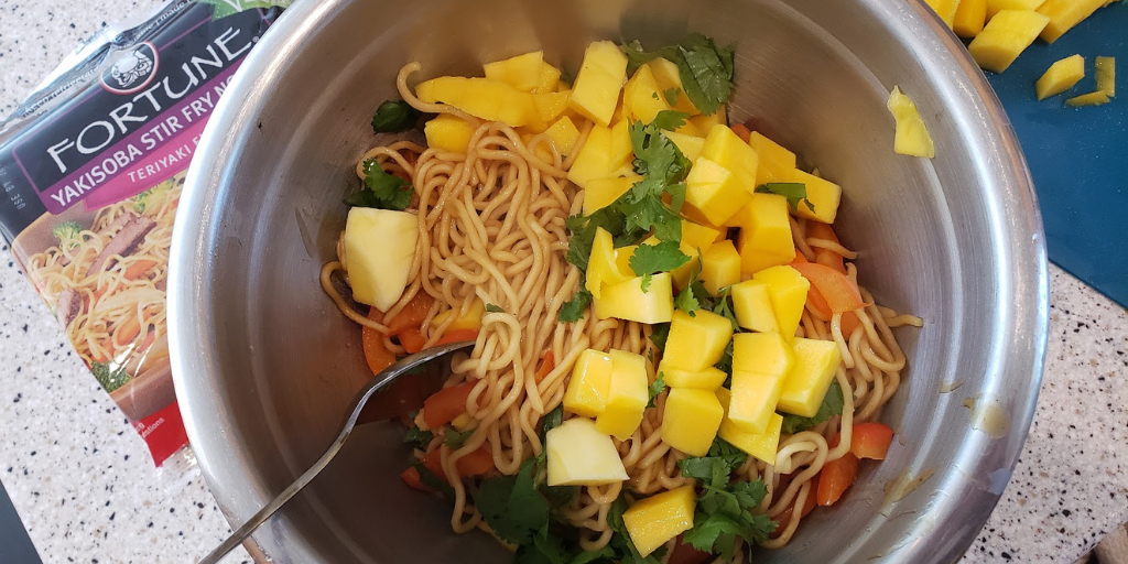 I love all things mango, so why not add mango to my stir fry noodle dish! There are no rules in stir fry! Using the Teriyaki Mango JSL Yakisoba Stir-Fry Noodles, I cooked in fresh bell pepper and tossed in fresh mango chunks with cilantro for a sweet and salty combination.