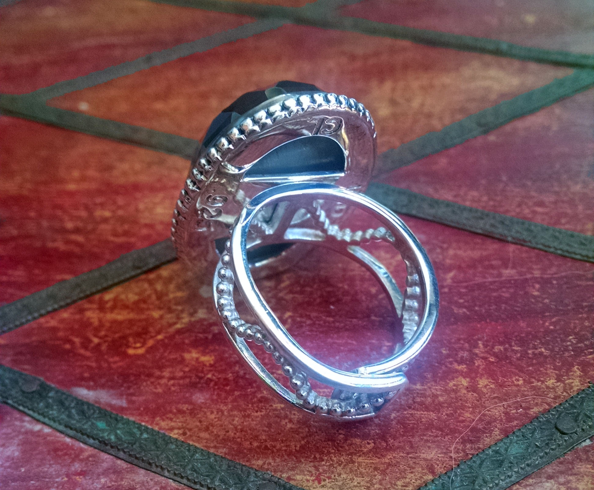 This is a large ring!! It is approximately 1 inch from end to end of the silver setting. It’s also an adjustable ring, but to warn you it’s still large even resized down. With the ring tightened a bit I would guess it’s about a size 9. You can size it up or down, but I would say this ring is best for someone with larger fingers, or likes to wear big jewelry on a pointer finger, etc.