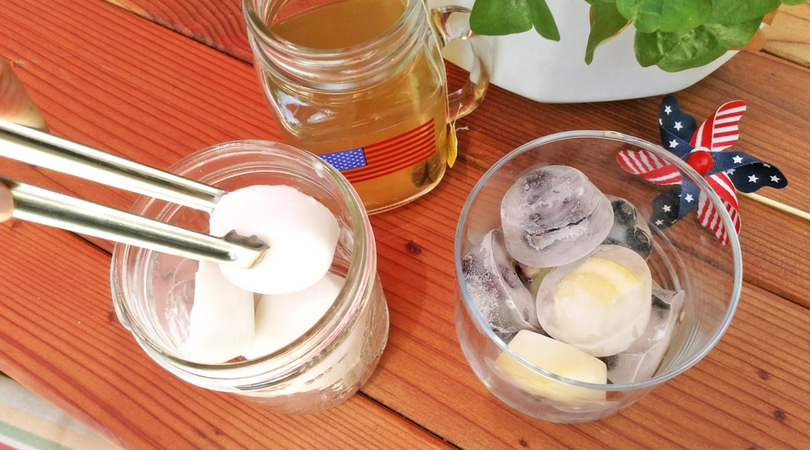 Set brewed Bigelow tea in a pitcher out on a table. I like to use old-fashioned jelly jars as glasses, as they just add to the traditional American decor.  Allow guests select their own cube cubes to put in their glass.  Bring out small batches of different ice cubes for guests. Smaller batches are easier to restock – if you have too many cubes out that are unused, they will just melt!