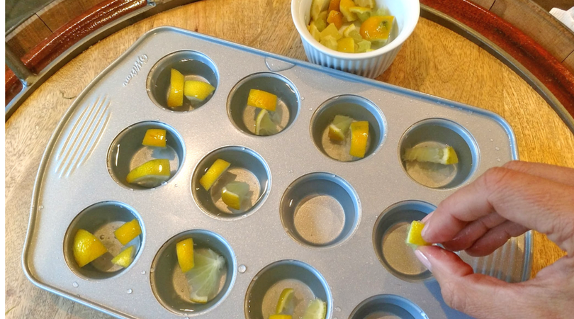 Lemon Cubes – Wash lemons and cut into medium to large chunks. Place inside muffin tins and add water to each well until almost to the top. Freeze for at least 2 hours until solid.