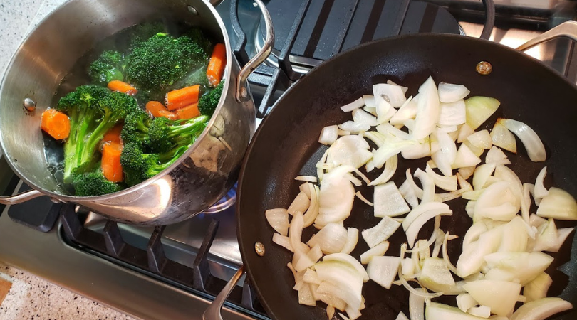 In a stock pot, cover broccoli and carrots with water and bring to a boil. Cook until tender. In a pan, saute’ onions in the vegetable oil until translucent.