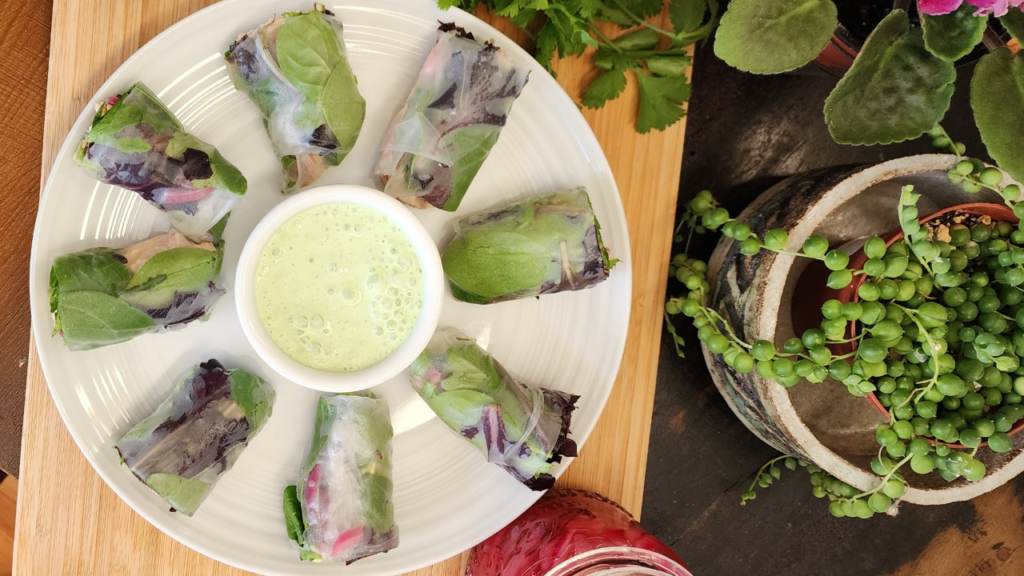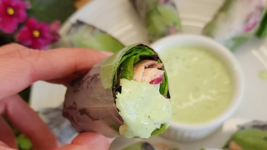 - Repeat and Enjoy: Repeat the process with the remaining ingredients. Cut the finished summer rolls in half on a diagonal for a beautiful presentation. Serve immediately with the creamy cilantro dipping sauce.
