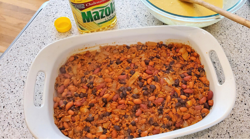 In addition to swapping out the butter in the cornbread, I also used Mazola Corn Oil to saute my onions and bean mixture, and I also used it to grease my casserole dish.