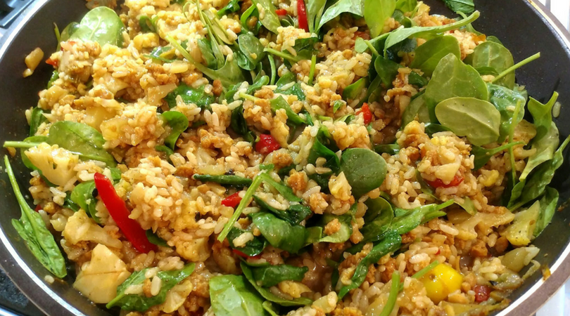Add in the water and curry powder. Cook until the oil starts to rise to the top. Add in Vegetarian Crumbles and caulifower florets. Lots of the water will start to absorb. Add in a little more if you’d like. Now is a great time to start seasoning with salt and pepper to taste.