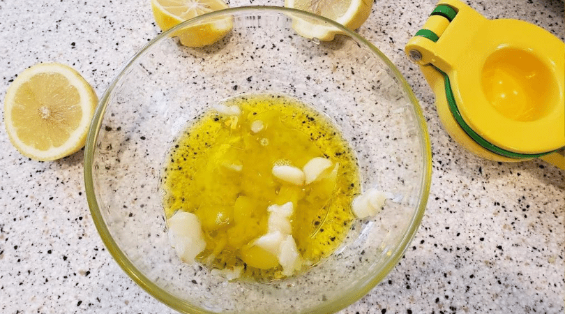 When garlic bulbs cool, gently sqeeze out the soft garlic into a bowl. Mix in 1/2 cup of quality olive oil and the juice from two lemons. Stir until well incoporated, may be a little lumpy and that’s ok.