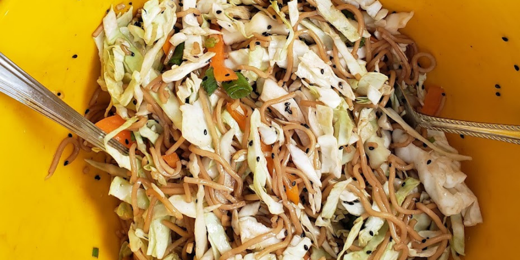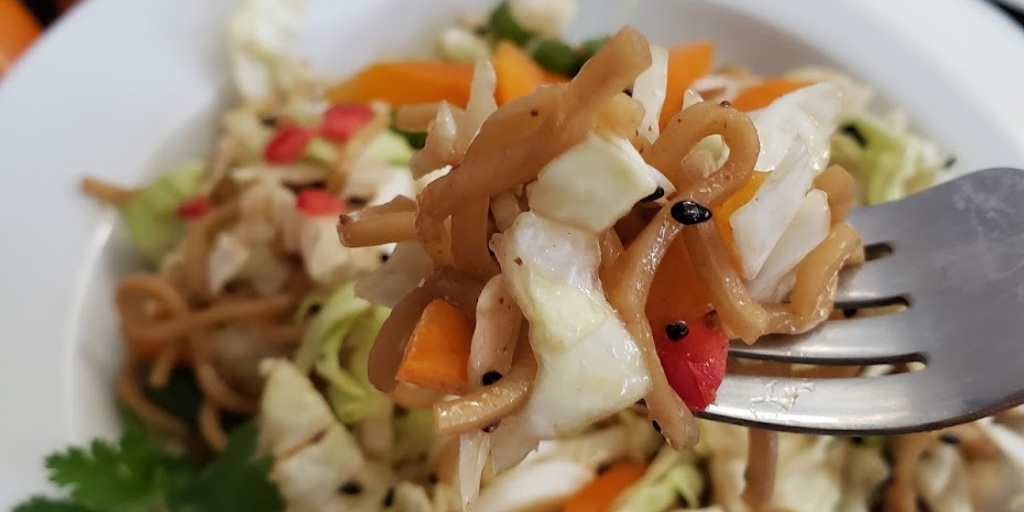 The warm noodles will gently soften the cabbage making it extra delicious! Optional – If you like heat, sprinkle on some diced red chili pepper on top of your salad.