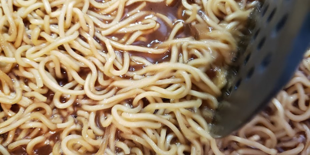 Pour in 1/2 cup of water. This is more than the package states, but we are making it a bit saucier as this will serve as the dressing for the noodle salad.