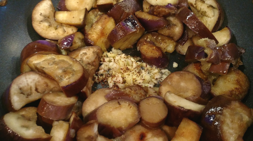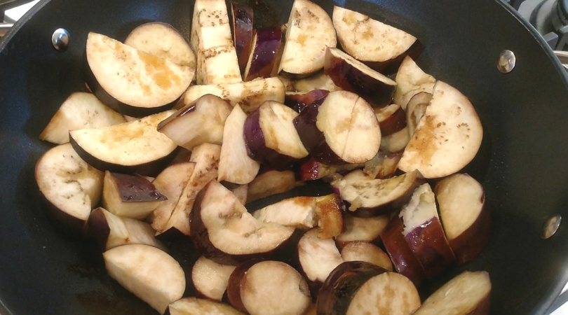 Saute the center ingredients for 2 minutes and then mix in with everything. Eggplant should still be moist. If you want to add a little more oil, go ahead, but keep in mind the eggplant will release moisture as it continues to cook.