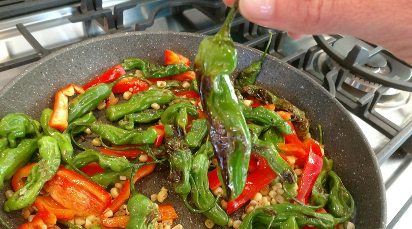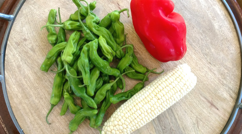 Summer means a bounty of fresh peppers and corn on the cob. This is a quick salad to make, but will need time to chill. Using fresh summer shishito peppers, this salad will have a kick – or will it? They say 1 out of 10 shishito peppers are spicy HOT, so you never know what you’re going to get! Sweet red peppers and sweet corn help offset the spiciness and the lime juice as a fresh zing.