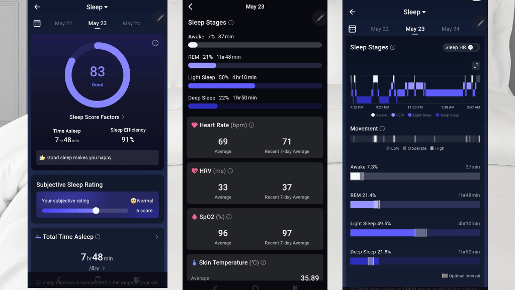 My husband has the OURA ring and continues to pay for that subscription, but there’s NO subscription with the RingConn which is a huge plus for me. I am not a fan of tech that is dependent on subscriptions! I’ve compared the app layout and data presentation, and both my husband and I are very impressed with how much content is available in an easy to navigate the RingConn format.