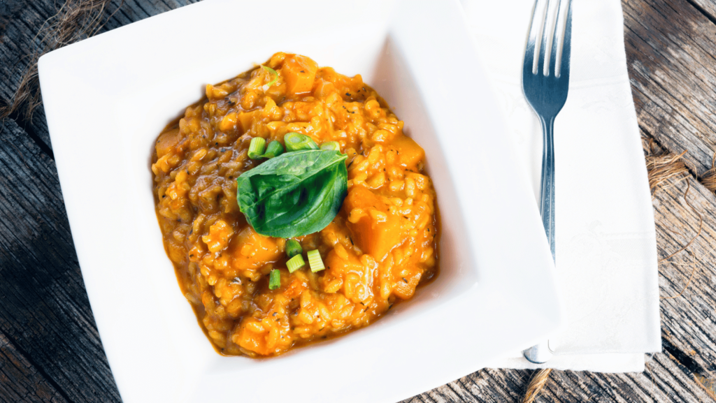Once the risotto is nearly done, fold in the roasted butternut squash and fresh sage leaves. Finish with grated Parmesan cheese, a knob of butter, and a sprinkle of black pepper for richness.