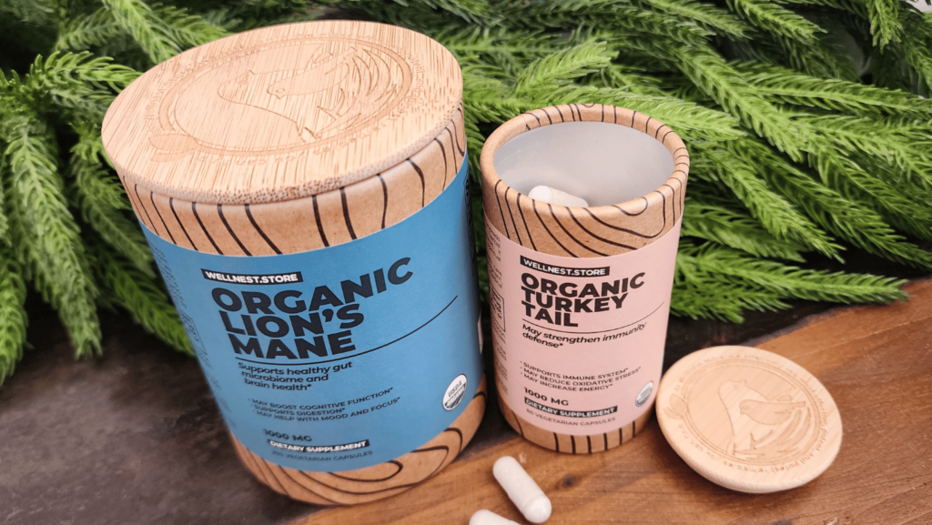 Look for options packaged with sustainability in mind, like these organic Turkey Tail and Lion’s Mane supplements from Wellnest.store.