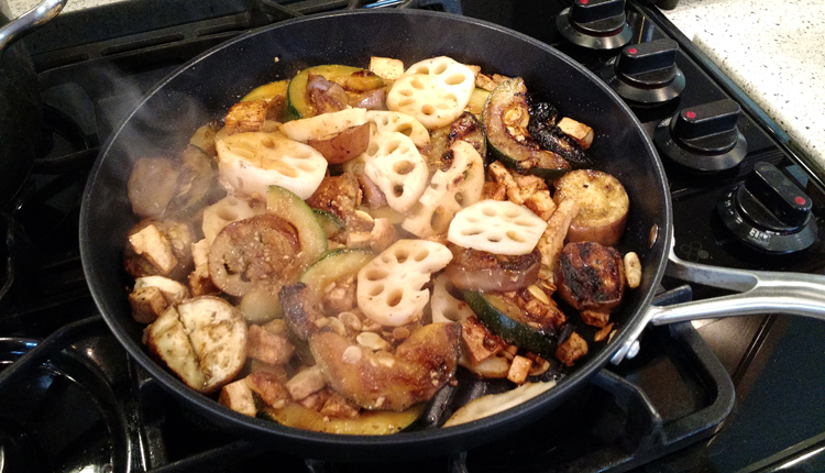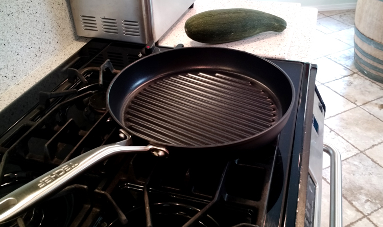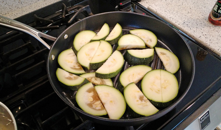 Add 1 tablespoon of sesame oil to the TECHEF Grill Pan and heat on medium. Carefully layer slices of zucchini and eggplant inside the pan.