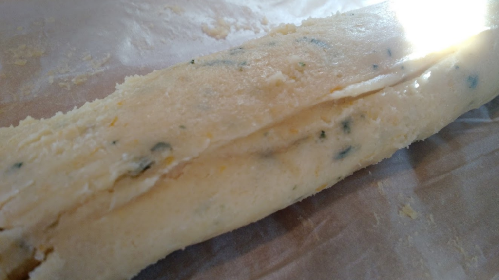 3. Turn dough out onto a piece of waxed paper and shape it into a log about 8 inches long and 1 1/2 inches in diameter. Wrap in plastic or wax paper and refrigerate for 2 to 24 hours.