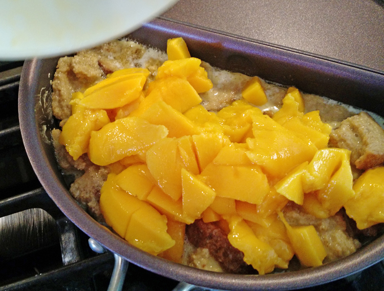 Put half of the soaked bread mixture into one side of the pan. Then add the mango evenly across the bread.