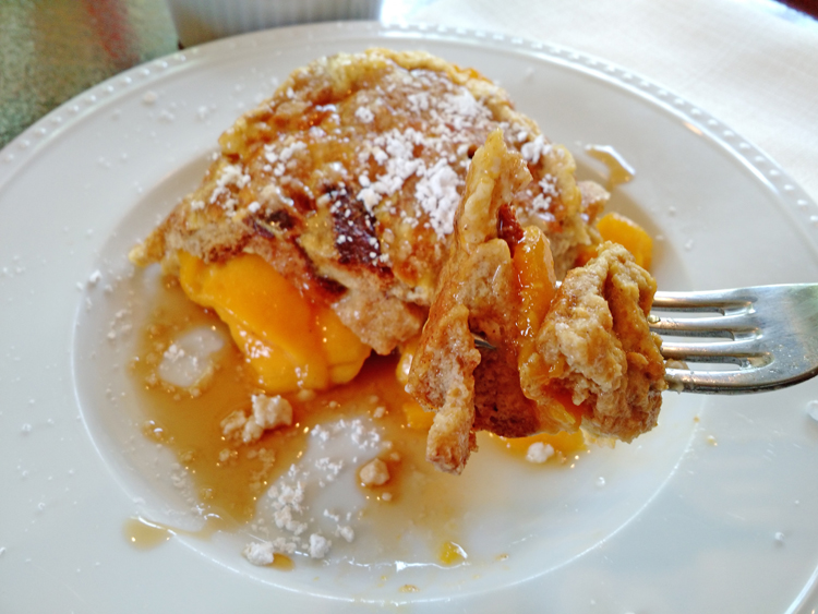 Take off heat and carefully flip or slide onto a plate. Let cool for a few minutes and then slice up. Put powdered sugar and syrup on and serve!