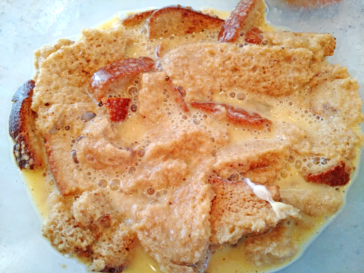 The French Toast Fritatta will rise and start to get firm on top. This is when you know it’s OK to flip it over. Holding a finger down on the lid of the Techef Frittata Pan, flip the pan over so you are cooking the wet bread mixture side.