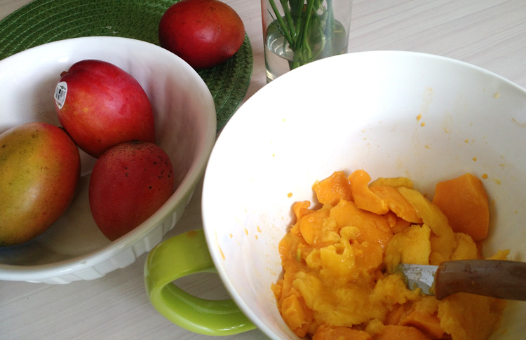 I used 5 fairly large mangos for this recipe. If yours are smaller, use 6. Try to get as much fruit off of the mangos as possible when slicing up.