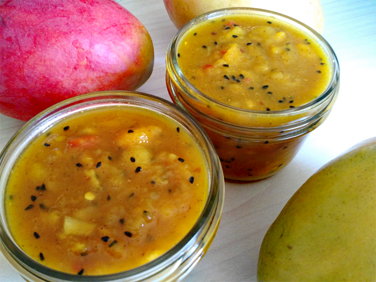 Heat the oil in a medium stock pot at medium heat. Saute the ginger, garlic and red chilies for a minute. Make sure to have your fan on, otherwise they spice mixture can make you cough 🙂 Add the spices and saute for another minute. Add the diced mangoes, sugar, salt, and vinegar and stir to combine. Bring it to a rapid boil and reduce to medium-low. Steady simmer on low for 1 hour and stir occassinally. I used a big spoon to mash up the big pieces as I wanted it to have a smoother consistency.