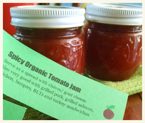 Spicy Organic Tomato Jam Serve as a spread with chèvre/goat cheese. Also very good with grilled pork, grilled salmon, chicken, burgers, BLTs, and turkey sandwiches.